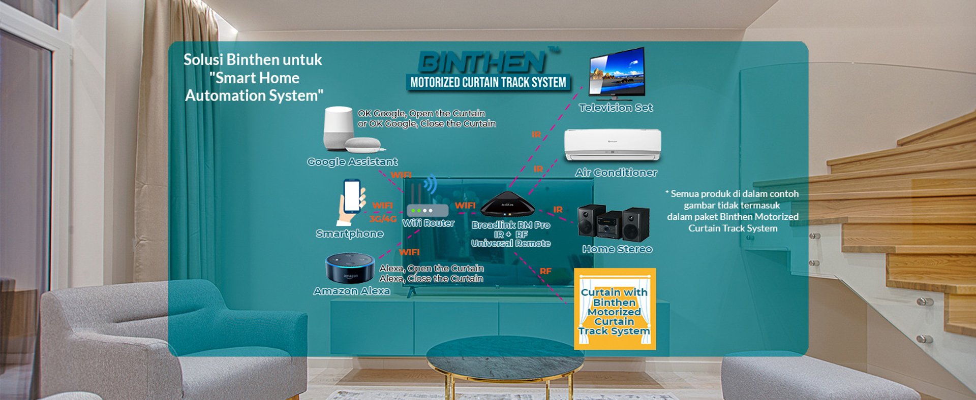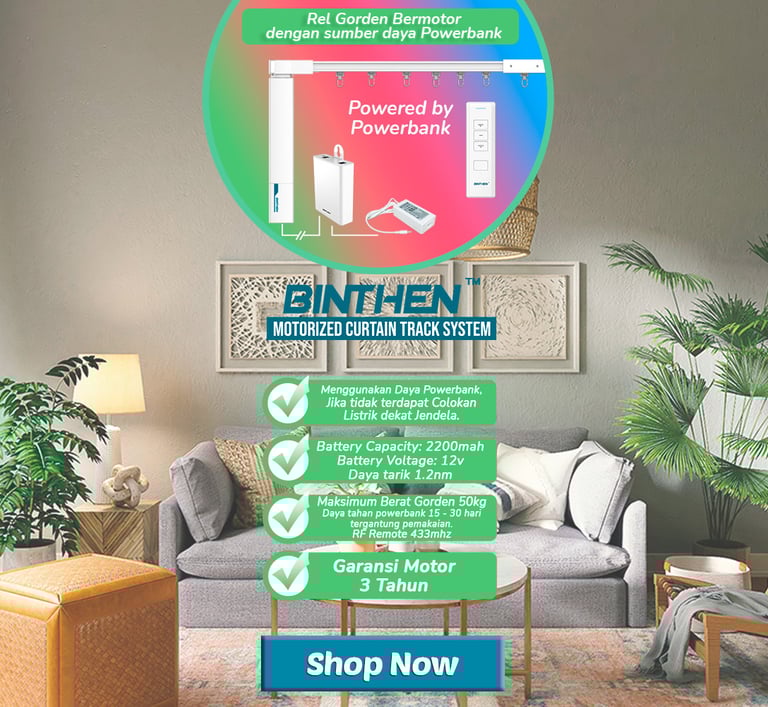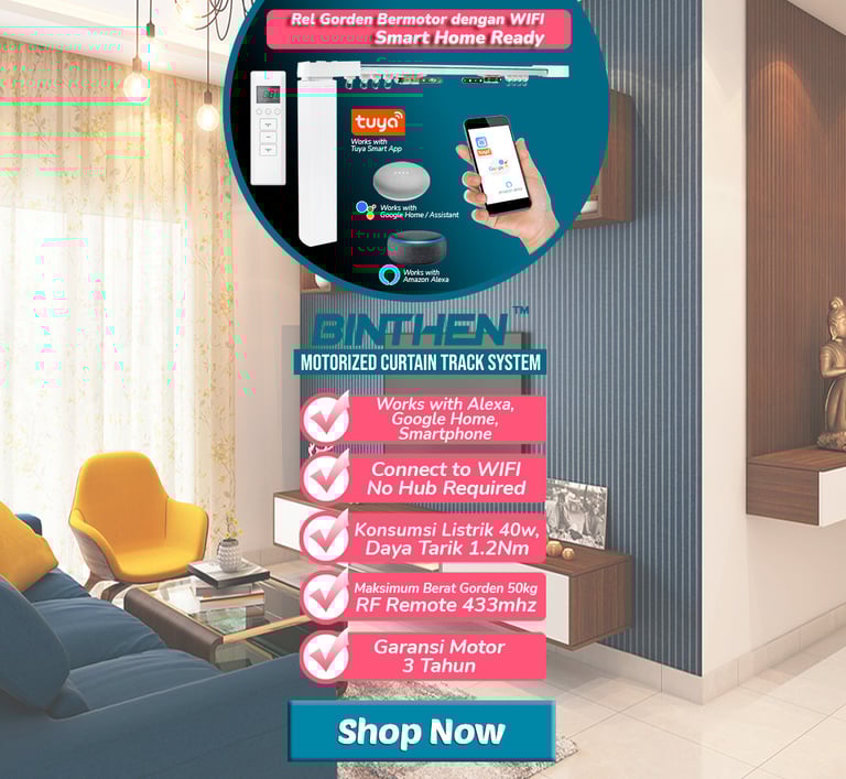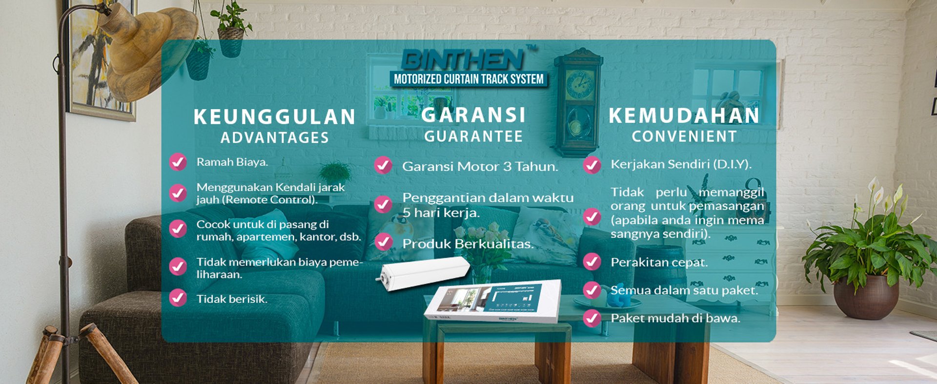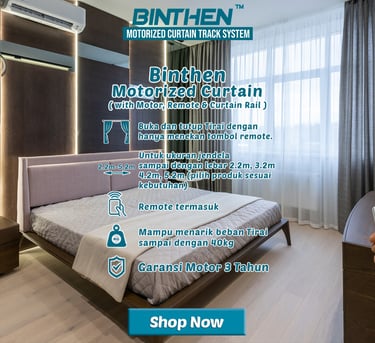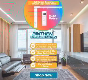 Paket Binthen Motorized Curtain Track System berisi : Rel Gorden, Motor penarik gorden, Remote Control dan Asesories (Gorden tidak termasuk dalam paket).